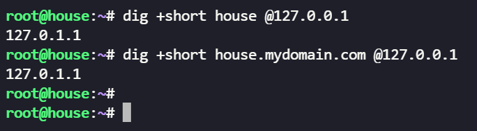 --expand-hosts 参数可以支持对 hosts 文件中的主机名,添加域名后缀的解析,使用 --domain=<domain> 参数指定后缀,比如上例中,如果添加参数 --expand-hosts --domain=mydomain.com ,那么解析 house 或者 house.mydomain.com 都会返回 hosts 文件中的配置。