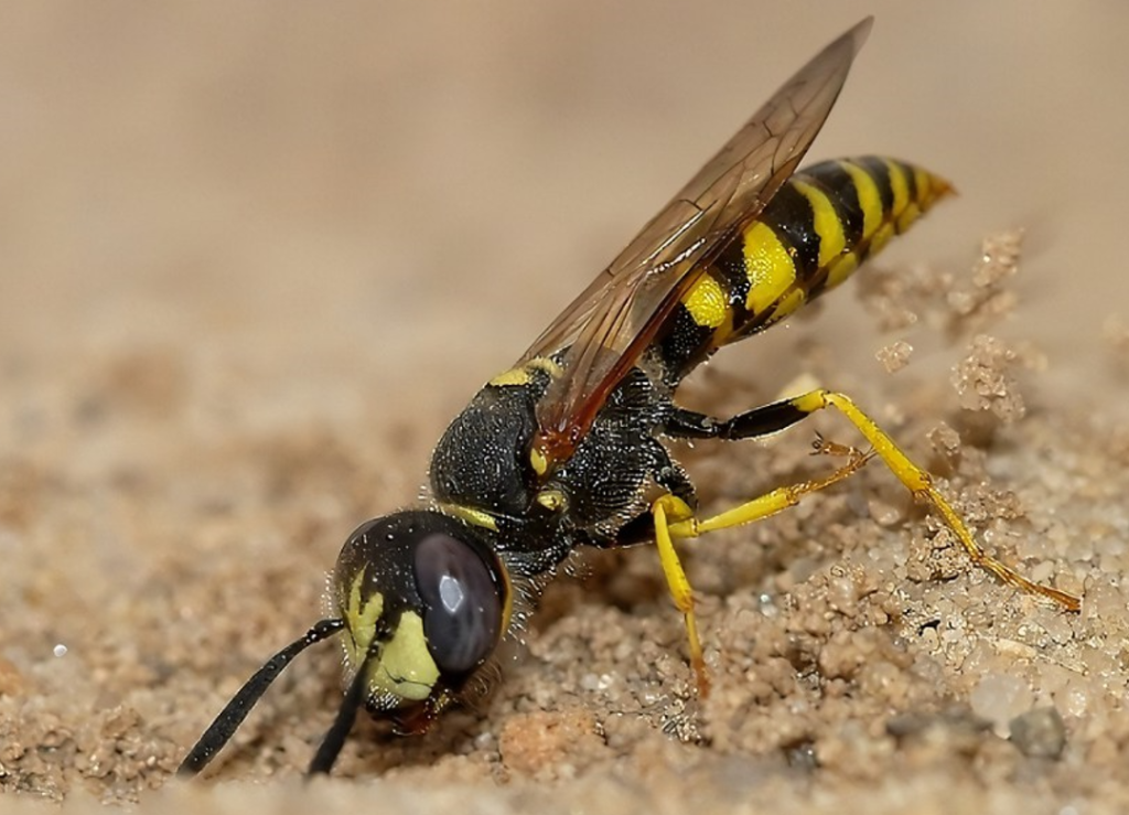 ‌蜂狼‌,也被称为大头泥蜂,蜂狼体长约为15毫米,头大,胸部黑色,腹部鲜黄色,头前部有较大的白斑。