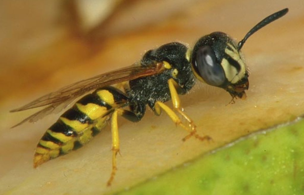 黑盾胡蜂,又称双色胡蜂,黄色胡蜂,体细,黄色,或红黑色,胸部有黑色小盾片