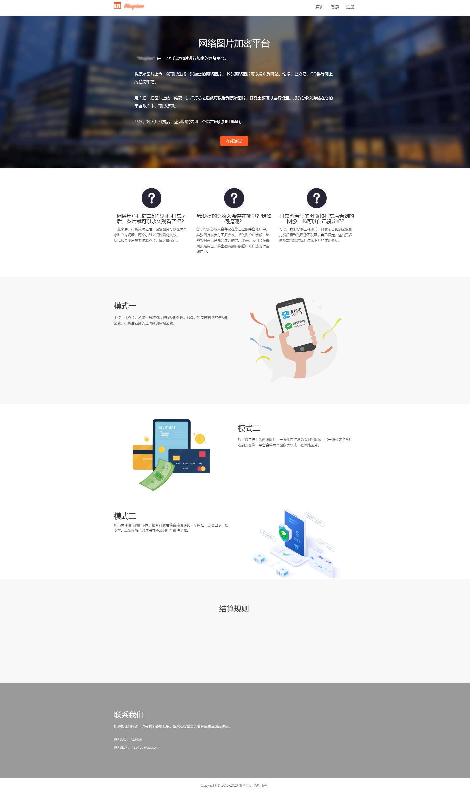 图片加密平台包含三种模式上传图片。支付接口支持对接微信 jsapi,支付宝当面付,码支付,xorpay 支付等,